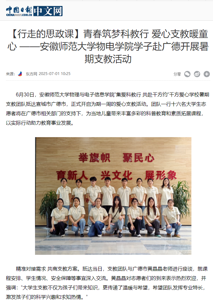 夏日的广德,青山如黛,绿意盎然。支教队员们表示,将牢记“厚德、重教、博学、笃行”的校训精神,用知识播撒希望的种子,以青春之力书写新时代青年的责任与担当。
