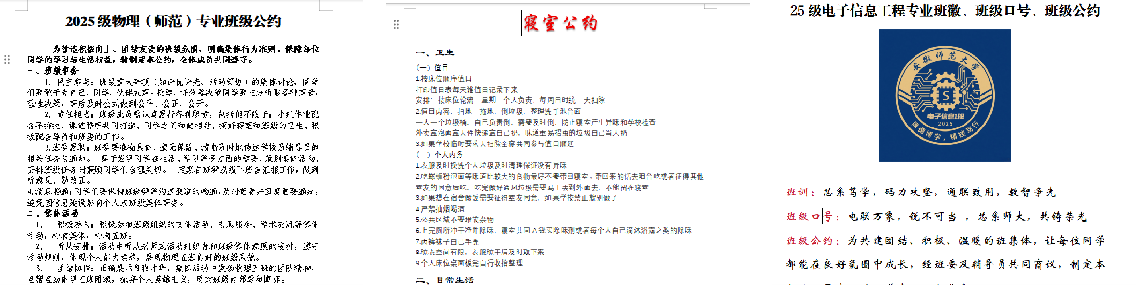为锻造班级核心力量,班级临时负责人竞选作为首次评比开展。候选人通过竞演展现服务热忱与责任担当,勾勒出班级服务核心轮廓,为班情凝聚筑牢根基。为彰显班级特色,线上班徽设计评比紧随其后,班徽作品让班级特色与共识清晰化。班级公约设计评比同步开展,新生共筑公约明确准则,推动班规落地,增强归属感。三次评比从核心选拔到文化塑造、规则确立,层层递进强化班情班规认知。