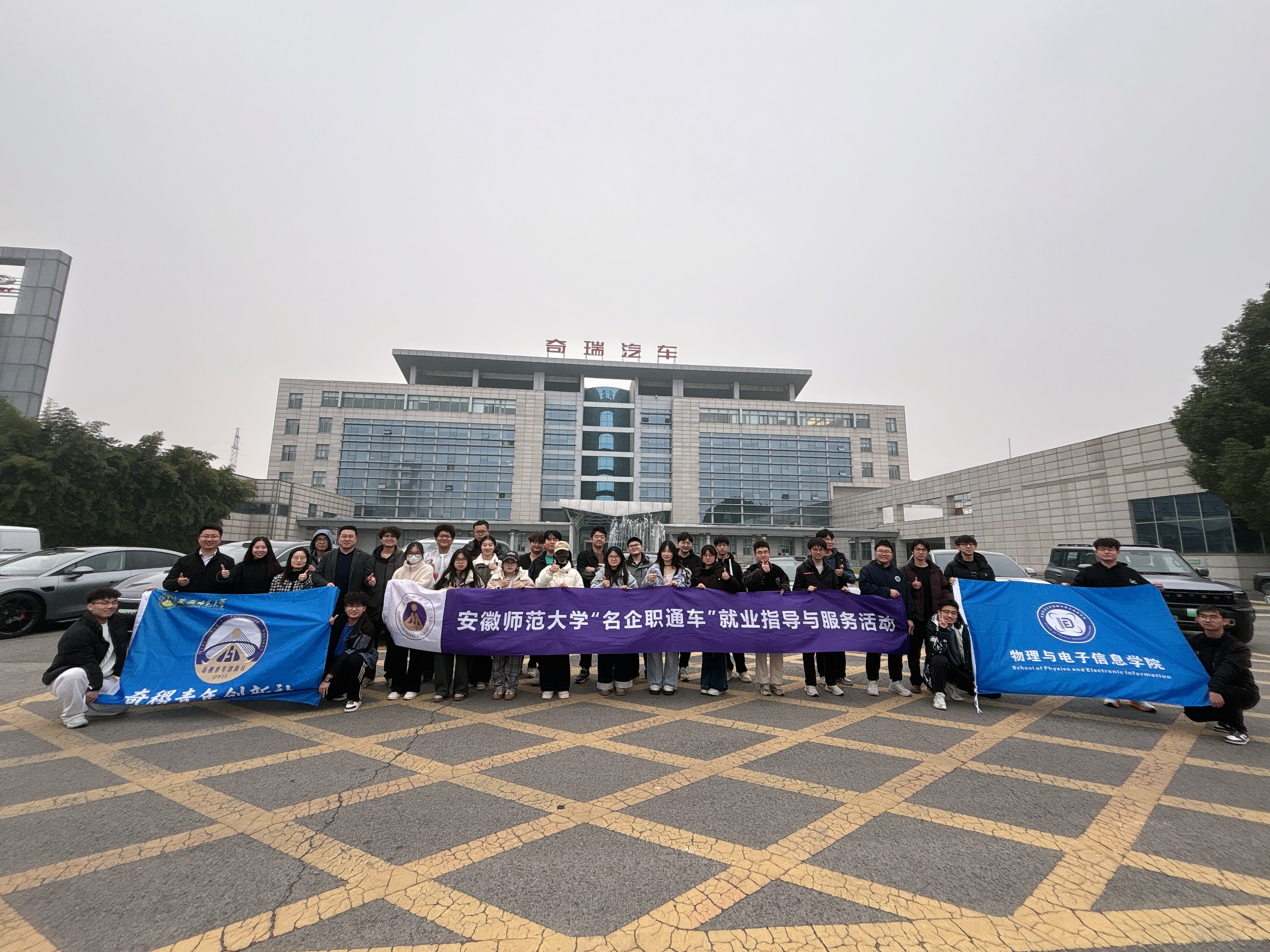 在奇瑞集团智能超一厂的焊装车间与总装车间,同学们近距离观摩了一辆汽车如何在高度自动化、智能化的生产线上“诞生”,对现代工业的“智造”实力有了直观而深刻的体会。在汽研院门口,同学们在讲解员的介绍和指导下,真实体验了奇瑞集团多款明星产品,了解了奇瑞汽车的技术亮点和设计理念,进一步感受到奇瑞在汽车研发领域的创新活力与品牌内涵。