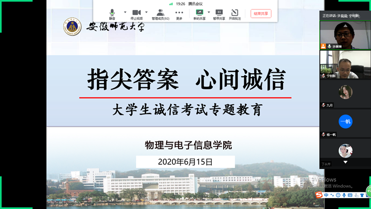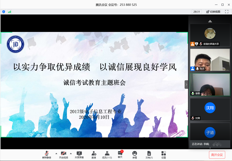免费足球直播app 2017级五个专业期末考试临近,分别召开以“诚信考试”为主题的主题班会,组织学生认真学习《安徽师范大学本科生课程考试管理办法》、《安徽师范大学考试纪律及违纪作弊处罚规定》等文件的相关规定,反复强调诚信考试的重要性以及作弊的严重性。免费足球直播app 全体院领导分专业进入各班“云”会议作动员讲话。同时,在辅导员的引导下,各班级选一名学生代表在线上进行宣誓:“诚实做人,诚信迎考”,用实际行动展现物电学子“严谨治学,诚信为人”的责任意识。主题班会意义重大,选在期末考试之前,为大家敲响了警钟。作弊不可取,分数可以重考,诚信却难以重修。在诚信教育的同时,辅导员们还为同学们准备了详细的复习策略,在整个免费足球直播app 树立“诚信应试,积极备考”的良好风气。