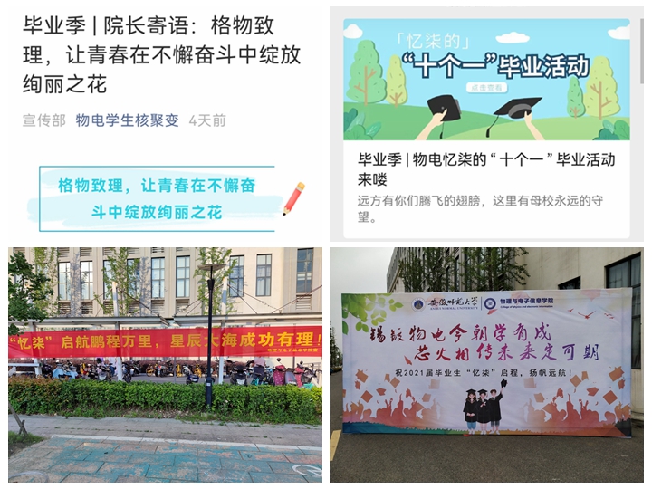 领导老师与同学们在敬文图书馆前合影留念,并提供专门定制的物电合影留念背景墙,为毕业生在留下珍贵瞬间,印刻美好记忆。一场晚会骊歌起,18日晚上,举办庆祝中国共产党成立100周年暨欢送2021届毕业生文艺晚会、制作“放心去飞”毕业祝福视频,隆重举行“最受学生喜爱的教师”“优秀毕业生”评选表彰。一件实事送一程,全体领导班子、专业负责人、辅导员深入学生宿舍走访慰问,为毕业生送去人文关怀,现场排忧解难。为每位毕业生购买了编织袋打包行李,定制了个性化的毕业纪念品。发动教师私家车、租用交通工具,帮助学生运送行李。积极推进、有力组织“为母校留下美好”毕业生宿舍清扫行动。