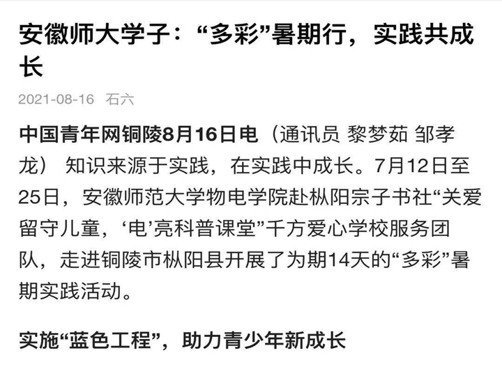 本网讯(千方爱心学校赴枞阳支教团队)知识来源于实践,在实践中成长。7月12日至25日,安徽师范大学免费足球直播app 赴枞阳宗子书社“关爱留守儿童,‘电’亮科普课堂”千方爱心学校服务团队,走进铜陵市枞阳县开展了为期14天的“多彩”暑期实践活动。