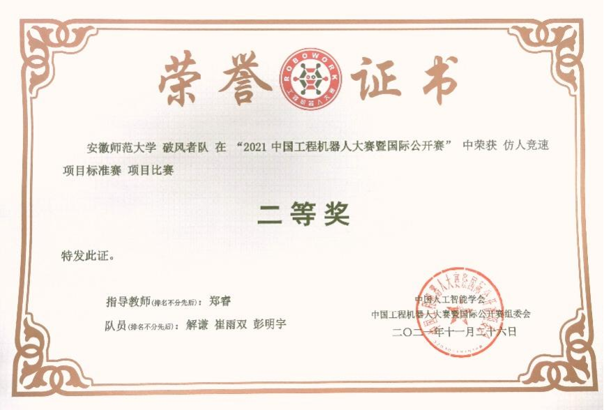 在该项赛事国家级奖项“零”的突破。2022年暑期,解谦带领“破风者”团队参加中国工程机器人大赛暨国际公开赛,与清华、北大、东南、哈工大等传统强校同台竞技,这也是我校历史上首次实现走上全国乃至国际机器人竞赛,最终在全国总决赛的赛场上斩获国家级二等奖的优异成绩。