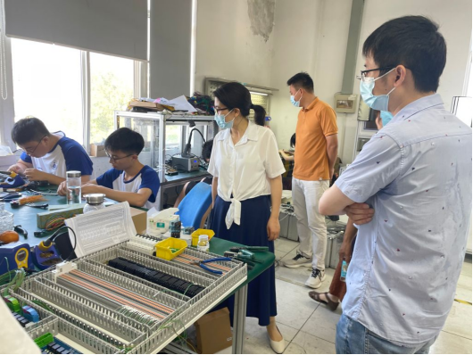 在埃泰克汽车电子有限公司,副院长张爱清参观了产品研发部、生产部和软件部,结合现场介绍,就制作、加工、技术等细节与工作人员和实践学生进行贴心交流,了解实践实况。她强调,希望同学们在社会观察、国情考察、产业体察中了解国情社情民情,感受祖国发展变化,感受各行业蓬勃发展的生动实践,真正在社会实践中受教育、长才干、树形象。