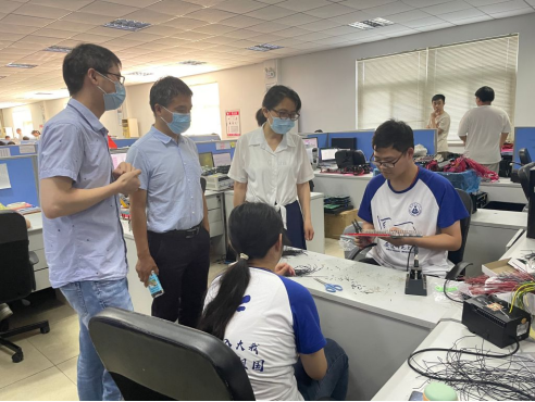 在金工实训中心,郑贤锋院长为参加学科竞赛的同学带来了慰问品与温暖的鼓励。他与同学们亲切交谈,叮嘱大家一定要注意休息,养足精神,在比赛期间尽全力去比赛,取得佳绩。在实验使用设备时要注意安全,注意自身安全和实验室实验仪器的使用安全,任何情况下都要把自己的生命安全放在第一位。最后,郑贤锋希望同学们在比赛过程中勇于克服困难,遇到困难勇敢向前,重在坚持不轻言放弃,并预祝同学们比赛取得佳绩。