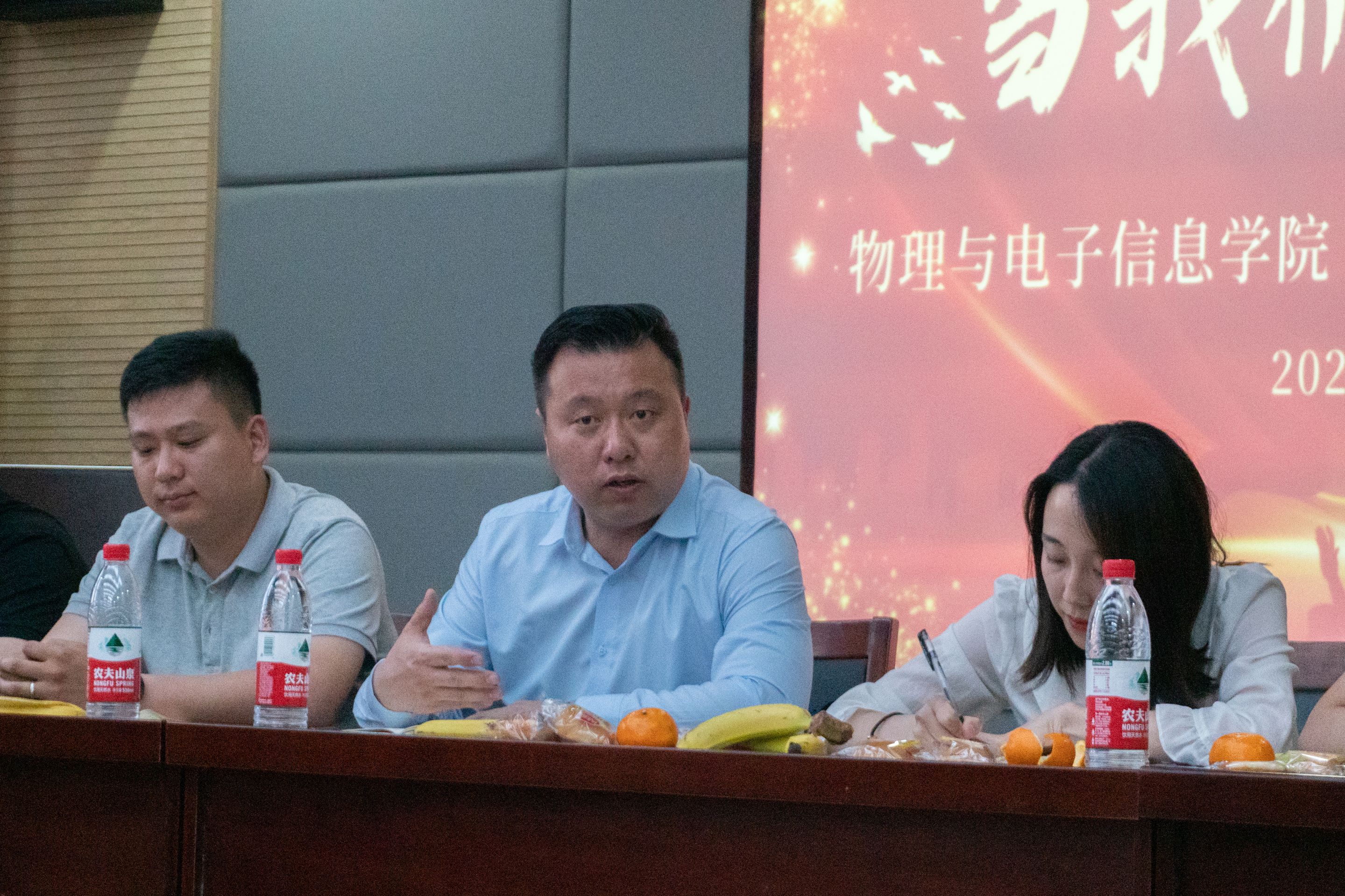 优秀学子事例为支撑点,对团员青年提出三点要求:一要高擎理想旗帜,筑牢信仰之基、二要登攀知识高峰,锤炼过硬本领、三要涵养高尚情操,提升文明素养,拿出“自找苦吃”的精气神,把握好时代的机遇,在新时代新征程上奋发作为、奋发有为,为国家的发展,注入新鲜动能。党委副书记黄友生重申了总书记对青年的殷殷期望,勉励物电学子要把稳青春之舵,托举时代重任。黄友生以“信仰”“情怀”“奋斗”“坚持”四个关键词为切入点,与青年学子进行了深入交流。