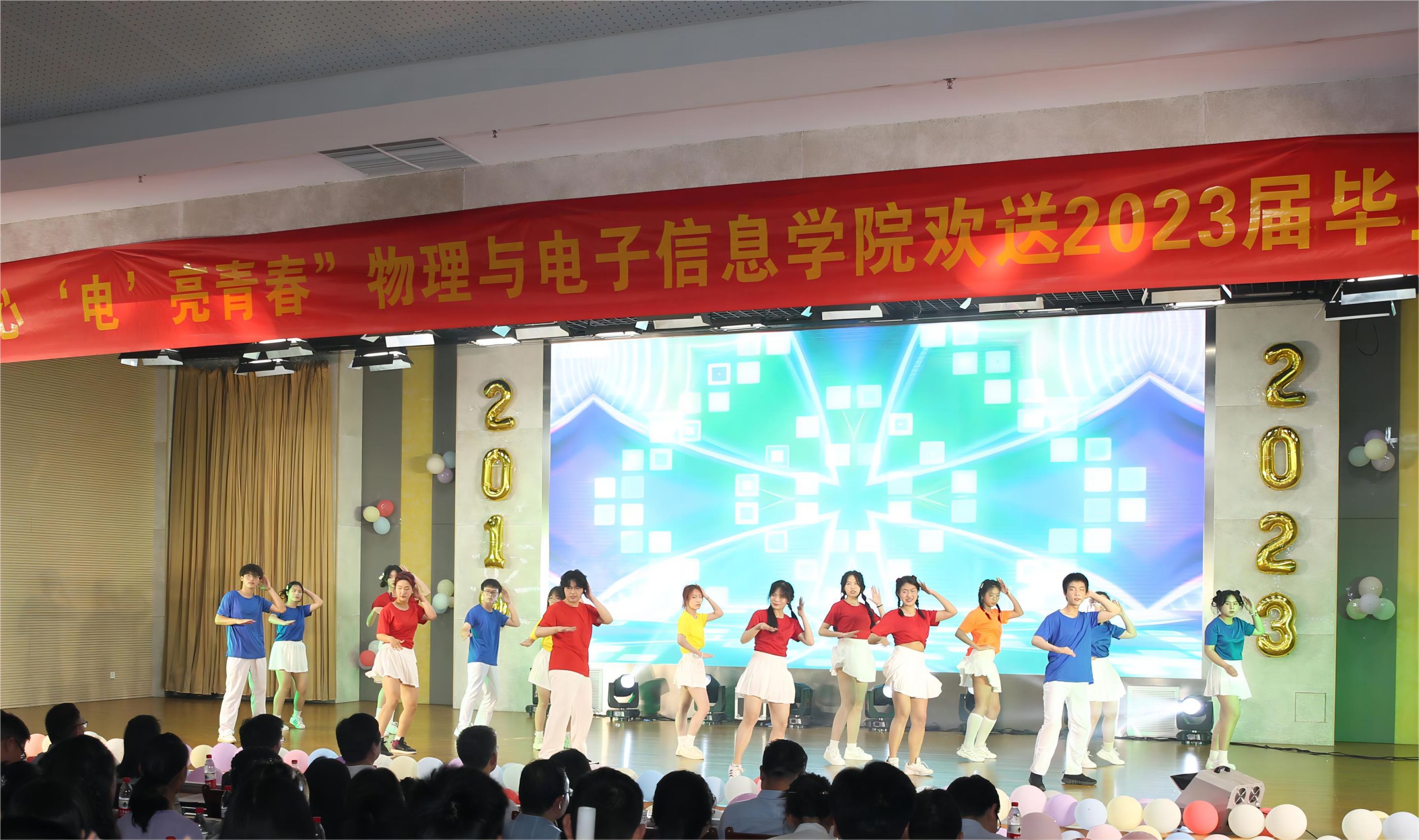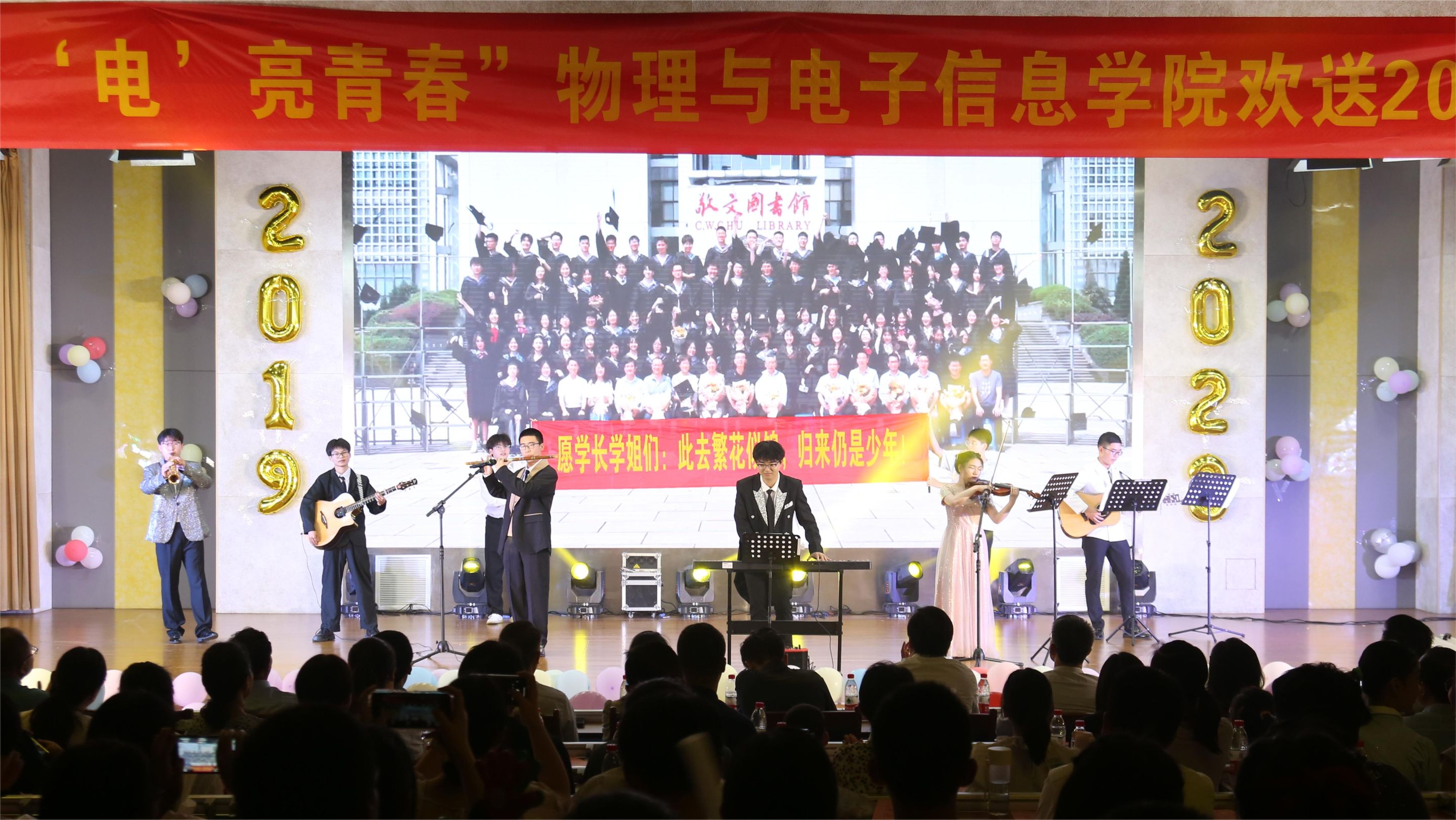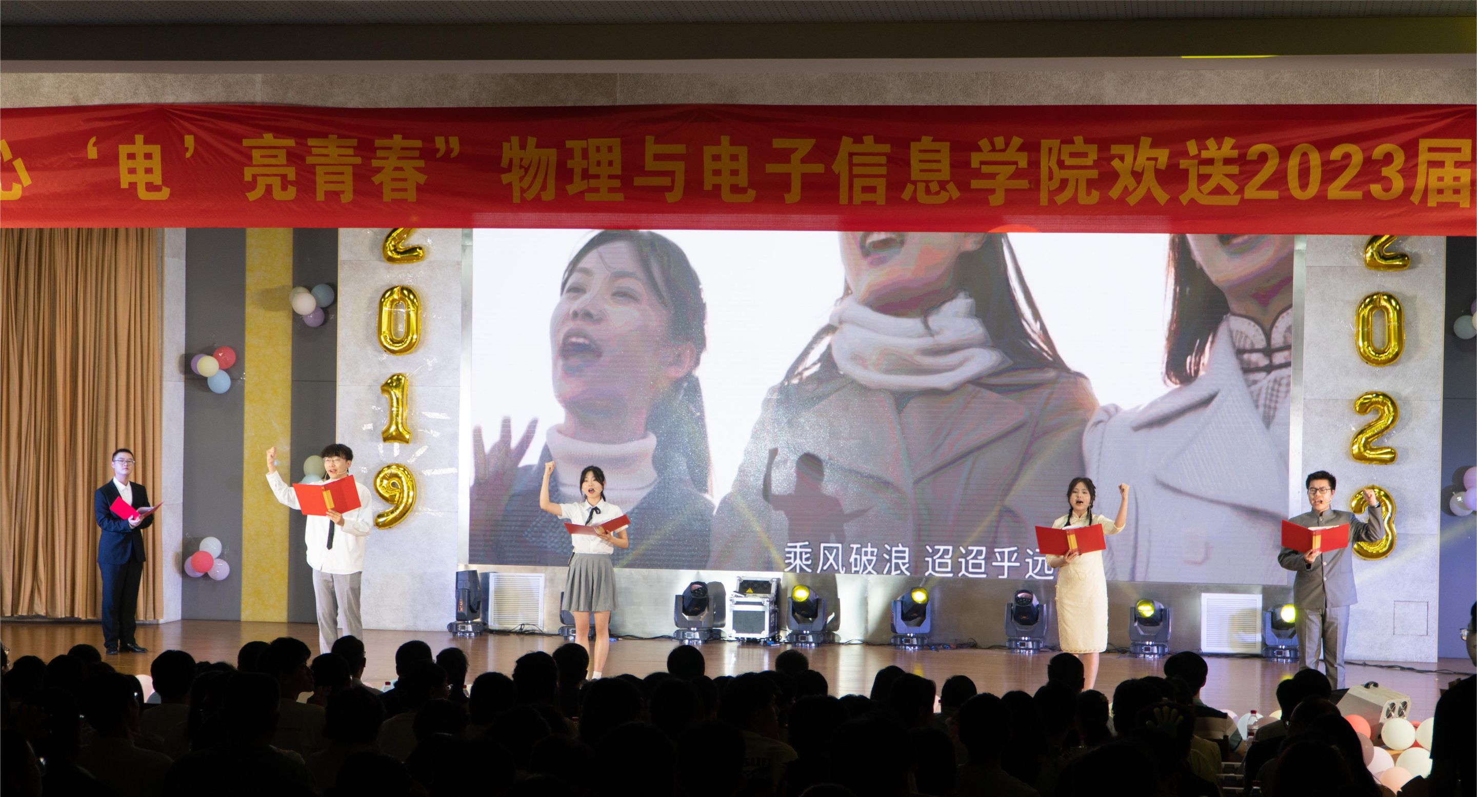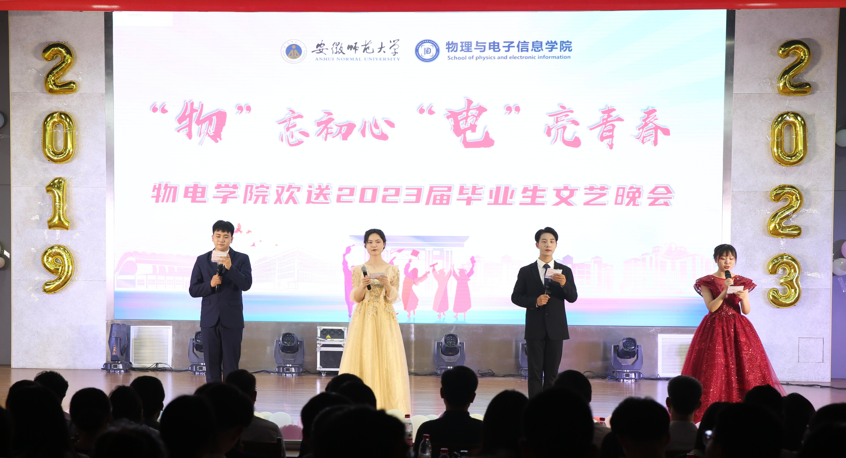 整场晚会共分为新青年·不忘初心、新使命·勇于担当、新征程·矢志奋斗三个篇章。节目涵盖了歌曲、舞蹈、乐器弹奏、舞台剧等多种形式,内容新颖又独具特色,充分展现了物电学子多才多艺、自信昂扬的风采以及对毕业生们真诚祝福。晚会现场精彩纷呈,高潮迭起,气氛火热。