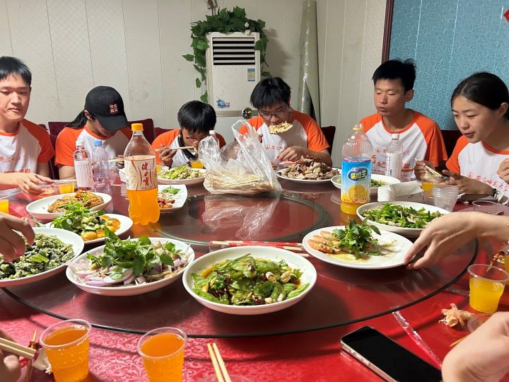 热情款待,共进晚餐。在许书记的盛情招待下,团队队员团聚一起饱餐一顿,谈论着接下来将要进行的活动和各自负责的任务。晚上回到住宿,大家各自整理了今天的收获,并开始投入明天支教活动的准备工作之中。