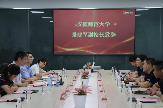 副校长景晓军在与芜湖美智空调设备有限公司副总经理韩祖金的谈话中指出,双方应进一步提升校企合作深度,强化校企协同育人,为培养出国家需要的创新型、复合型、应用型人才而不断努力。“空谈误国,实干兴邦”,景晓军寄语实践团队队员要坚定理想信念,脚踏实地,提升专业素养,积极投身强国伟业,为民族复兴不懈奋斗。之后景晓军和韩祖金为“安徽师范大学大学生社会实践基地”揭牌。最后,与会全体人员合影留念。