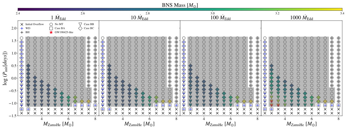 张莞婷同学一直对天文学有着浓厚的兴趣,依托“大创”项目,通过学习和熟练使用细节双星演化数值模拟工具MESA,借助免费足球直播app 的算法服务器,长期开展了近1000多个双星系统演化的数值模拟,搜寻可以形成GW190425的演化渠道,成功发现在1000倍超爱丁顿吸积下大质量中子星系统生存的参数空间。研究还计算出该双中子星系统在形成之后可以通过引力波辐射最终并合成一个黑洞,对约束中子星的质量上限以及理解特殊引力波源的形成机制具有重要的科学价值。