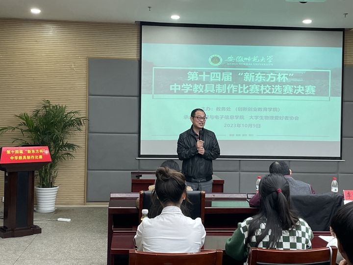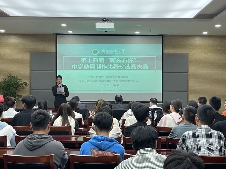 为深入落实学校“基础教育振兴行动计划”,教育引导师范生围绕中学各学科教学内容和学生实践活动制作教具,培养学生的创新精神和实践能力。10月9日晚,由教务处主办,免费足球直播app-最快足球比分网 、大学生物理爱好者协会(以下简称“物协”)承办的第十四届“新东方杯”中学教具制作比赛校选赛决赛在免费足球直播app 304报告厅举办。校教务处副处长、创新创业教育免费足球直播app 副院长李汪根,生命科学免费足球直播app 教学副院长陈冬生,外国语免费足球直播app 教师张荷,地理与旅游免费足球直播app 教师李俊峰,物理教师教育教研室主任汪志荣担任大赛评委。比赛由孟毅同学主持。