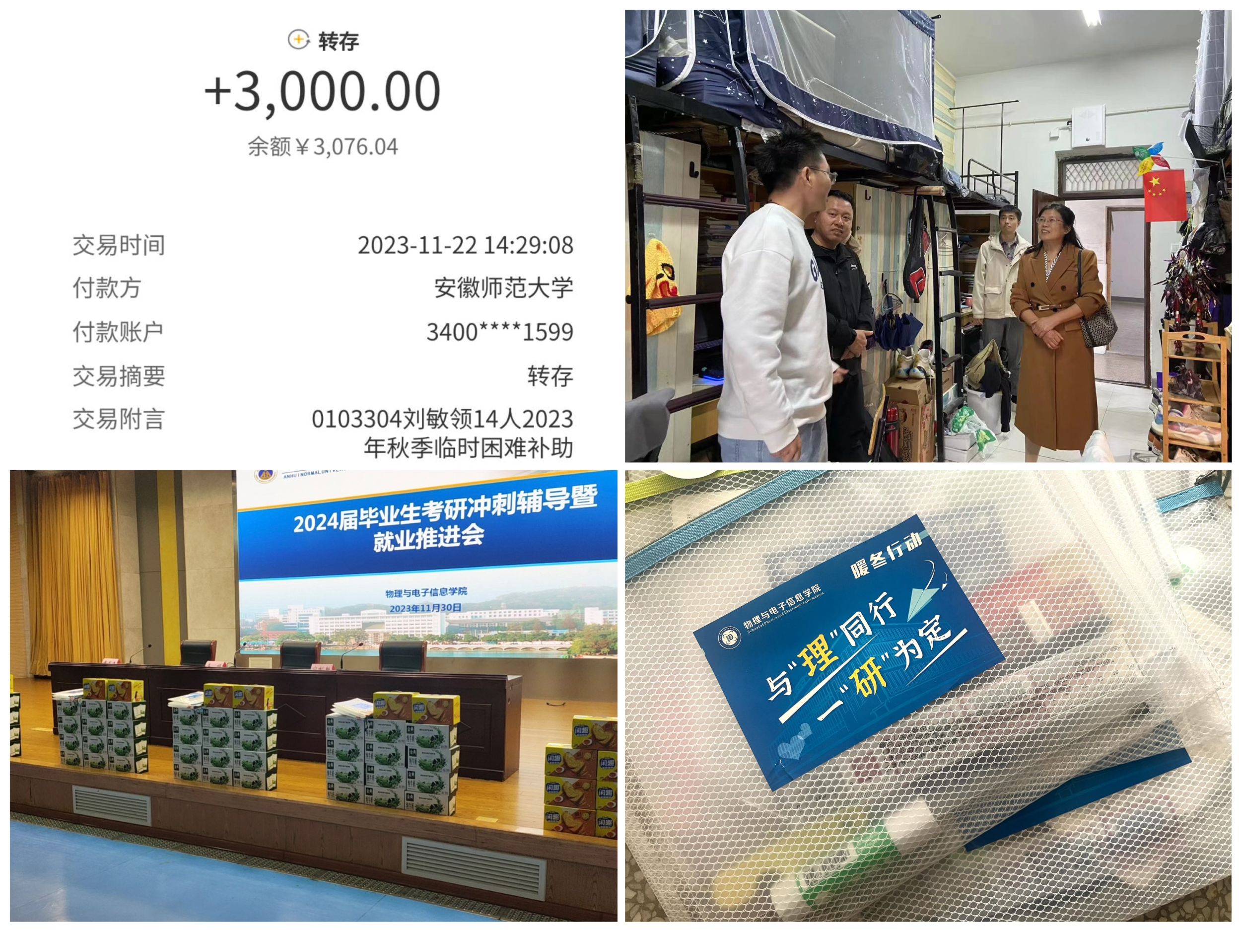 还多形式、多层次地为老生送去冬日温暖,按照困难等级为460名经济困难生全覆盖发放暖冬电费补贴,将53530元补助直接打入学生银行卡,让资助“润物无声”;为二、三年级经济特别困难学生送去“暖心能量包”,保温杯、围巾、手套、抽纸、洗衣液......“花样”生活大礼包给学生传递满满正能量。