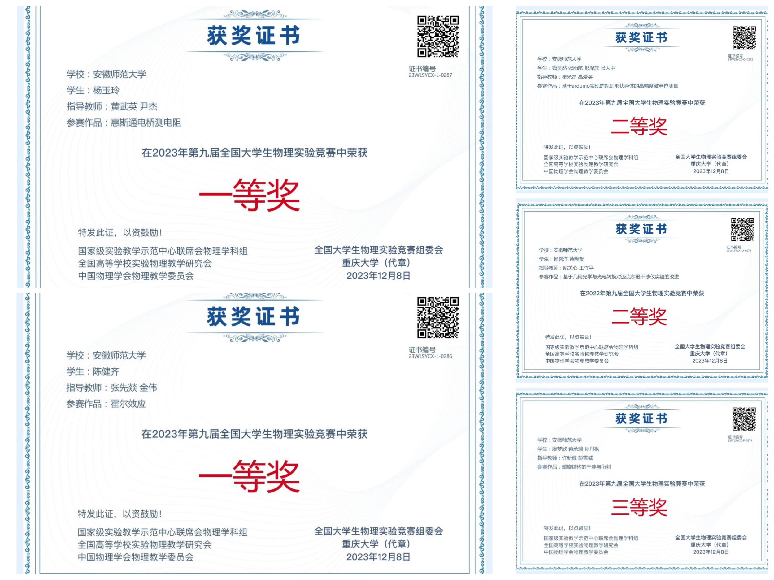 高度重视,精心组织了多轮培训打磨。经过数月的针对性打磨和强化性训练,陈健齐、杨玉玲的作品在指导老师们的带领下双双晋级决赛。决赛环节,选手面对众多评委进行现场模拟授课以及现场答辩。最后,我校讲课类作品《霍尔效应》(指导老师:张先燚、金伟)和《惠斯通电桥测电阻》(指导老师:黄武英、尹杰)突出重围,均获全国一等奖。另外,我校自选类作品《基于arduino实现的规则形状导体的高精度微电位测量》(指导老师:崔光磊、高爱英)和《基于几何光学与光电转换对迈克尔逊干涉仪实验的改进》(指导老师:姚关心、王竹平)获全国二等奖,许新胜、彭雪城老师指导的命题类作品《螺旋结构的干涉与衍射》获全国三等奖。