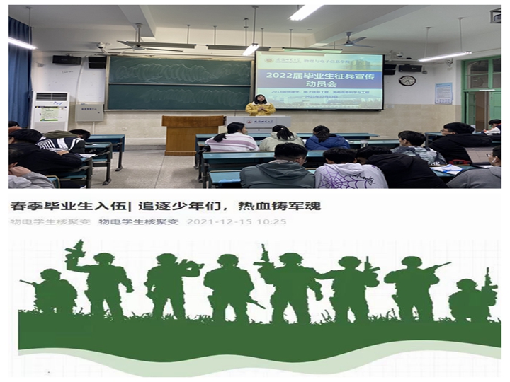 注重宣传教育,政策条件早知晓。线下发力,落实征兵政策宣传。毕业班辅导员通过组织收看征兵入伍宣传视频、开展2022届毕业生征兵动员会等形式走进班级落实政策宣讲。线上宣传,营造参军入伍良好氛围。通过微信公众号、QQ等多个新媒体平台,让征兵入伍政策真正深入学生脑里心中。
