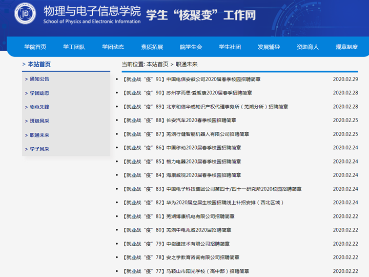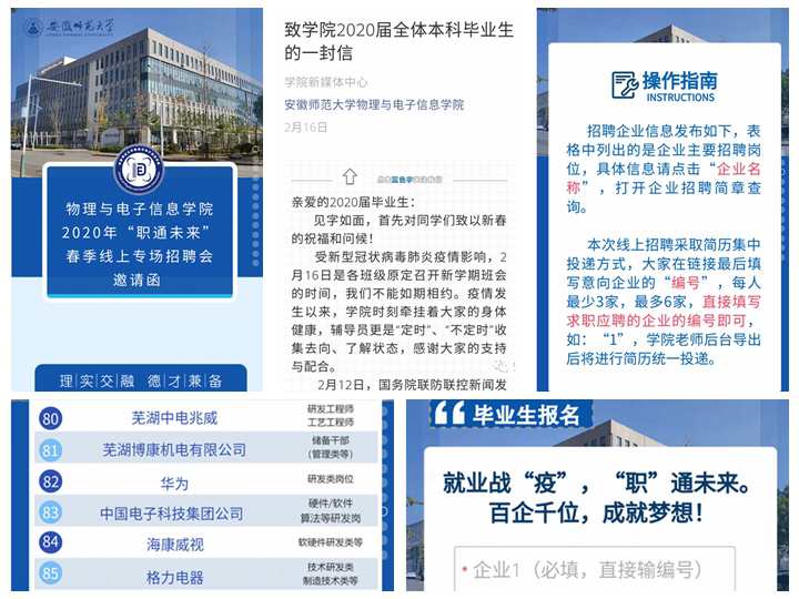 2020届全体本科毕业生的一封信》;17日-22日,审核用人单位报名材料,逐一发布企业招聘简章至院学工网就业专栏;25日,发布“职”通未来战疫征集令,供学生查阅、报名;3月1日,学生求职简历集中投递至用人单位;3月5日-10日,举办集中线上视频招聘宣讲。
