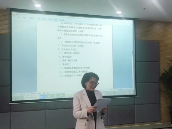 会上,院长郑贤锋带领学习习近平在中央人才工作会议上的讲话精神,要求教师们要认真学习贯彻,把会议精神转化为做好人才培养工作和自身发展的强大动力;李娟作专题辅导报告,从辛亥革命的贡献、历史意义、五个启示和台湾问题等方面对习近平总书记在纪念辛亥革命110周年大会上发表重要讲话进行了详细解读;张爱清副院长通报了教育部网站公开曝光的师德失范典型案例,并领学安徽师范大学教师师德失范行为清单;李娟就师德师风建设问题及“双减”专项整治工作进行了强调,并要求全体教师将师德师风建设贯穿教育教学全过程和教师生涯全过程,向优秀名师学习,涵养高尚师德,以师德失范典型案例为反面教材警示自己,守好三尺讲台,潜心立德育人。