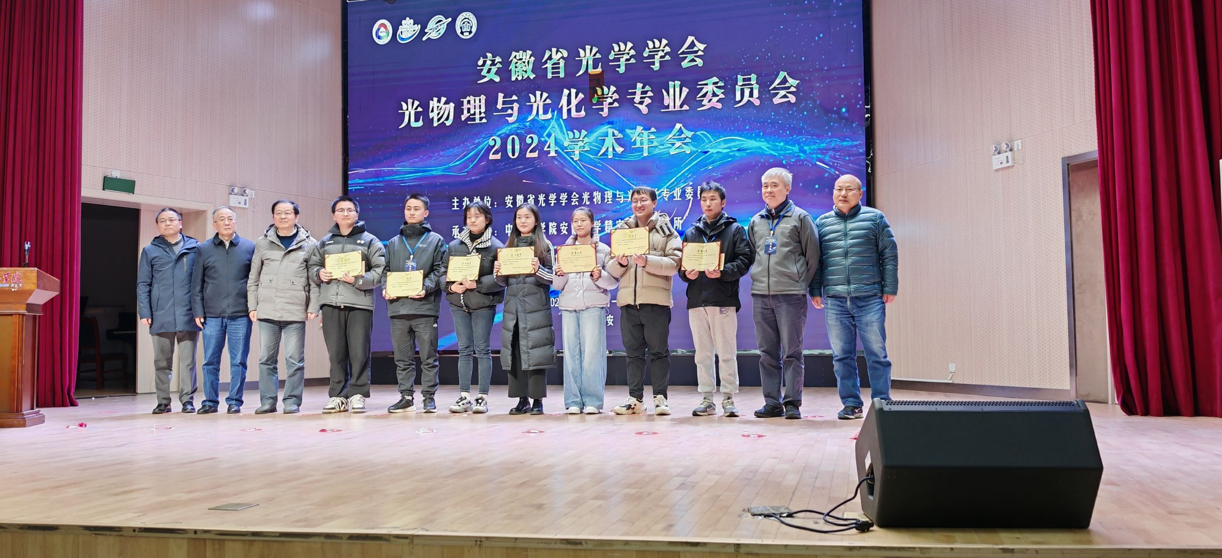 合肥物质科学研究院、合肥工业大学、安徽大学、安徽师范大学、安庆师范大学、南京信息工程大学等省内外10多家单位的160余名代表参加了本次年会,并贡献了48场精彩的学术报告。课题组多位老师和同学参加会议并作学术交流。其中,课题组青年教师赵春一博士以《二维钙钛矿光物理性质及载流子动力学研究》为题作大会主题报告,徐新杰同学作研究生主题报告,刘榕同学和梁超龙同学参加了墙报交流活动并在大会上作研究生快闪报告。最终经过专家评选,徐新杰同学荣获优秀论文表达奖,梁超龙同学荣获优秀海报奖。
